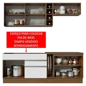 Itens inclusos: - Um (1) Balcão de Pia com duas (2) gavetas e uma (1) porta (Não acompanha tampo deste balcão) - Um (1) Porta-Panos com tampo em MDP - Um (1) Balcão com duas (2) portas e tampo em MDP - Um (1) Armário Aéreo com duas (2) portas com detalhe - Um (1) Armário Aéreo com uma (1) porta basculante - Uma (1) Adega
