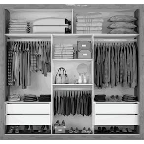Ele é desenvolvido com MDP resistente e roldanas de aço carbono com rolamento. Conta com três portas de correr, quatro gavetas e diversas divisões internas que facilitam na organização dos seus pertences.