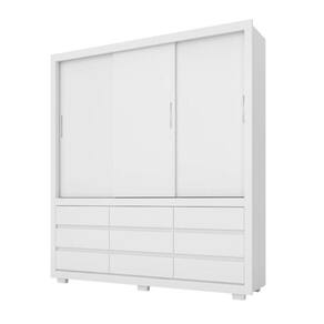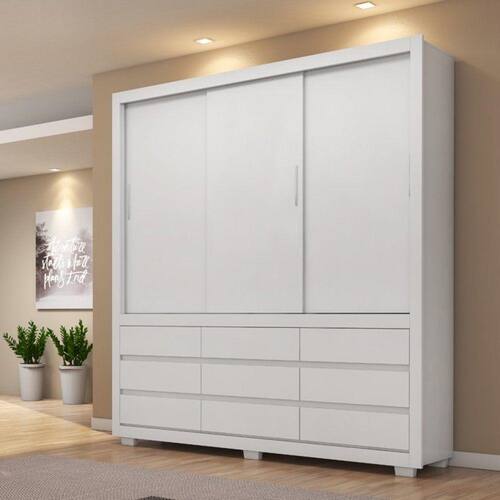 Guarda roupa com 3 portas de correr, conta com 9 gavetas externas com corrediças metálicas, cabideiros em alumínio, prateleiras centrais e maleiro completam a boa capacidade de organização. Todas as principais fixações de estrutura são feitas com porca cilíndrica proporcionando maior solidez do produto e proporciona a vantagem de uma nova montagem se necessário.