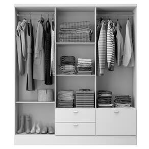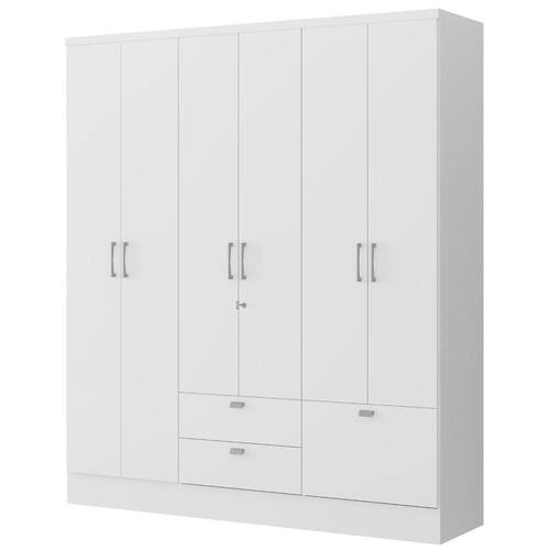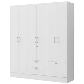 Com visual jovem e moderno, o roupeiro possui 06 portas com abertura tradicional. Na parte inferior, com 02 gavetas na esquerda e um gavetão na direita. Esse gavetão apresenta um diferencial especial para a organização, pois possui amplo espaço para guardar cobertores, travesseiro ou calçados. Internamente o produto possui cabideiro para roupas longas ou curtas e prateleiras para roupas dobradas. As portas centrais possuem uma fechadura para armazenar objetos de maior valor.