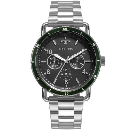 Relógio Technos Executive. Com caixa e pulseira de aço em banho prata o modelo tem em seu aro o tom esverdeado que dá o toque de estilo ao modelo casual.