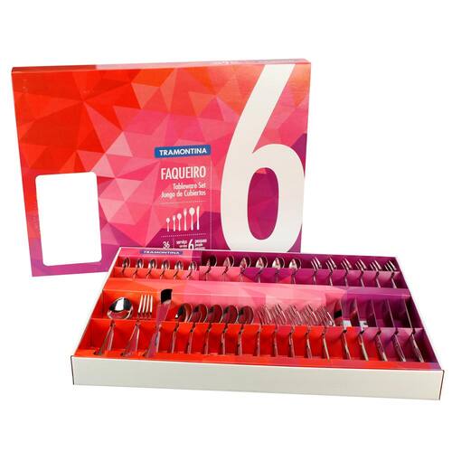 O Faqueiro Tramontina é totalmente feito em aço inox e serve até 6 pessoas. Altamente durável, mantém as características originais, preservando a beleza, a higiene e a durabilidade do material. Peças com polimento em alto brilho e detalhes em baixo relevo no cabo, valorizando seu design. Podem ser levadas, diariamente, à máquina de lavar louças.