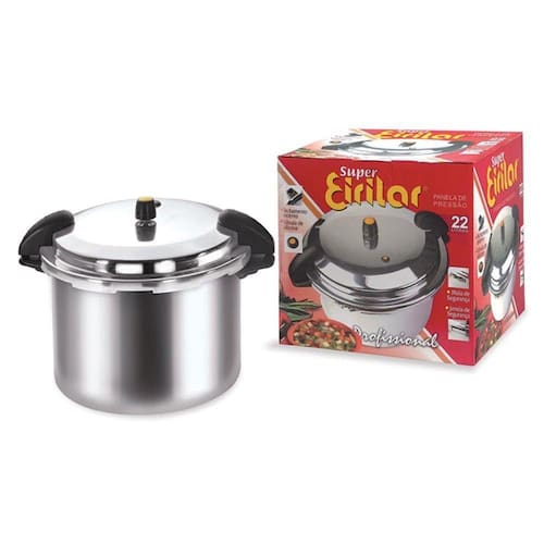 Panela de Pressão de fechamento externo para uso profissional, confeccionada em alumínio, fabricada pela Indústria de Alumínios Eirilar Ltda., tradicional Empresa do setor. Designe moderno e alta tecnologia, garantindo fácil manuseio, segurança e grande capacidade de produção. Ideal para restaurantes, cozinhas industriais, eventos e grandes famílias. Acabamento com polimento de alto brilho. Desde que obedecidas as instruções de uso inseridas nas embalagens, esta panela de pressão é 100% segura, sendo certificada pelo INMETRO e garantida pela Eirilar por dois anos. A pressão de trabalho é de 80 KPA, oferecendo maior rapidez no cozimento de alimentos e conseqente economia de energia em comparação com outras existentes no mercado com pressões de trabalho inferiores. Vide gravação no fundo da panela. As alças confeccionadas em baquelite, com designe anatômico que facilita o manuseio, resistem ao calor propagado pelas paredes das panelas ao serem levadas ao fogão. Borrachas de vedação e válvulas são de silicone que garante uma perfeita vedação, mesmo quando submetidas a altas temperaturas em função do cozimento dos alimentos. Uma grelha de alumínio está inserida neste modelo, tendo em vista manter os alimentos fora do contato direto com o fundo da panela. Este modelo de panela conta também com uma janela de segurança que é um sistema adicional que funcionará caso a pressão interna se eleve acima do normal. No caso de obstrução simultânea do tubo de pressão central e da válvula de segurança. Sistema de oito travas garante o perfeito travamento da panela, assim como evita que seja aberta enquanto houver pressão interna.