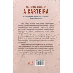 A Carteira Na lista dos dez mais vendidos desde o primeiro dia. 500.000 cópias vendidas! Uma história fascinante sobre coragem e emancipação feminina, e sobre dois irmãos inseparáveis destinados a amar a mesma mulher. Anna Allavena, a carteira: a história extraordinária de uma mulher aparentemente comum que se muda do norte da Itália para o sul e se torna a primeira carteira em uma pequena cidade na região de Salento. Em junho de 1934, Carlo e Anna descem do ônibus na praça principal de Lizzanello, em Salento. Ele está feliz por voltar para casa, no sul, mas ela, uma mulher do norte, tão bela quanto uma estátua grega, sente-se preocupada com o futuro nessa terra desconhecida. Para os moradores, Anna nunca deixa de ser "a forasteira" – não frequenta a igreja, evita a pequena cidade e não participa das fofocas. Orgulhosa e determinada, desafia as tradições locais e, após ser aprovada em um concurso público, torna-se a primeira carteira do local – ou melhor, a primeira "carteira", como prefere ser chamada. A Carteira, uma história de romance e liberdade feminina.