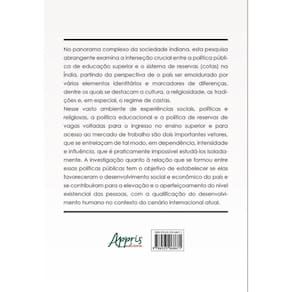 No panorama complexo da sociedade indiana, esta pesquisa abrangente examina a interseção crucial entre a política pública de educação superior e o sistema de reservas (cotas) na Índia, partindo da perspectiva de o país ser emoldurado por vários elementos identitários e marcadores de diferenças, dentre os quais se destacam a cultura, a religiosidade, as tradições e, em especial, o regime de castas. Nesse vasto ambiente de experiências sociais, políticas e religiosas, a política educacional e a política de reservas de vagas voltadas para o ingresso no ensino superior e para acesso ao mercado de trabalho são dois importantes vetores, que se entrelaçam de tal modo, em dependência, intensidade e influência, que é praticamente impossível estudá-los isoladamente. A investigação quanto à relação que se formou entre essas políticas públicas tem o objetivo de estabelecer se elas favoreceram o desenvolvimento social e econômico do país e se contribuíram para a elevação e o aperfeiçoamento do nível existencial das pessoas, com a qualificação do desenvolvimento humano no contexto do cenário internacional atual.