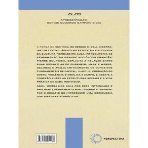 Foi Sergio Miceli quem praticamente introduziu os estudos sobre Sociologia da Cultura no Brasil, ao compilar e organizar textos de Pierre Bourdieux em A Economia das Trocas Simbólicas, livro que está completando o cinquentenário de sua publicação. Este A Força do Sentido fornece a chave para a compreensão dos principais conceitos desse campo que se tornou indispensável para se entender os mecanismos de funcionamento das modernas sociedades humanas em sua complexidade estrutural e simbólica. QUARTA-CAPA A Força do Sentido, de Sergio Miceli, mostra-se um texto clássico no estudo da sociologia da cultura. verdadeira aula introdutória ao pensamento do grande sociólogo francês, Pierre Bourdieu, explicita a relação entre suas ideias e as de Durkheim, Marx e Weber, delineia e avalia criticamente os conceitos fundamentais de capital, habitus, produção do gosto, violência simbólica e campo, e debate a conexão entre as estruturas sociais e a vida prática de cada indivíduo. Aqui, Miceli nos guia por este intrincado e brilhante pensamento nos levando a enfrentar o desafio de introduzir uma sociologia dos sistemas simbólicos.