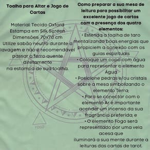 A Legítima Toalha Pentagrama Jogo de Cartas 70x70 cm Verde A Verdadeira e Tradicional Toalha de Mesa Pentagrama para jogos de cartas e AltarEsta é a Legítima Toalha de Mesa jogos de cartas, deixando sua mesa bonita, moderna e sofisticada e intuitiva. Desenvolvida pensando em deixar o seu jogo de cartas mais confortável e prático.É composta por tecido, linda estampa, o que oferece ainda mais requinte ao teu jogo. Boa Qualidade de impressão, podendo ser utilizada em altares, desenvolvida especialmente para jogos de cartas intuitivas.Características:- Composição: Tecido Oxford- Impressão: Silk Screen- Cor bem definida -- Tamanho: Quadrada 70 cm x 70 cm- Acabamento : Overlock- Extremamente leve, suave e confortável- Lavável em máquina Lava e SecaImagens meramente ilustrativas Embalagem de Envio: Envelope plástico, conforme necessidade do produto. Respostas das dúvidas mais frequentes na ordem:R1: Já realizamos milhares de entregas em todo o Brasil, somos especialistas no que fazemos.R2: Assim que seu pedido for despachado, esta plataforma envia para você o código de rastreamento.R3: Enviamos o produto 100% inspecionado e conferido em nosso checkout e são embalados em embalagem de papelão e plástico bolha.R5: Iremos despachar o seu produto o mais rápido possível, assim que for confirmado pela plataforma, enviamos em até 24h.R6: Nós queremos a sua satisfação, qualquer problema iremos te auxiliar em nossos canais de comunicações.