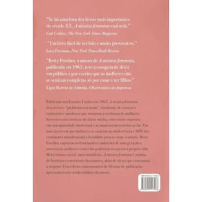 A mística feminina investiga como foi construída e mantida a norma social que defina mulher a partir de uma existência frívola, consumista, devotada ao lar, ao marido e aos filhos, à qual estaria fadada. Publicado originalmente em 1963 nos Estados Unidos e em 1971 no Brasil, o livro retorna às livrarias em sua edição comemorativa de 50 anos, com textos inéditos da autora, Betty Friedan.