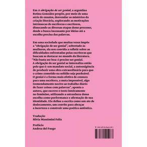 Em A obrigação de ser genial , a argentina Betina González propõe, por meio de uma série de ensaios, desvendar os mistérios da criação literária, explorando as motivações intrínsecas de escritoras e escritores e dissecando as diversas etapas desse processo, desde a busca incessante por ideias e a organização minuciosa do material até a escolha precisa das palavras e a construção de uma narrativa envolvente. Em uma sociedade que muitas vezes impõe a “obrigação de ser genial”, sobretudo às mulheres, ela nos convida a refletir sobre as dificuldades enfrentadas pelas escritoras que buscam se destacar no mundo da literatura. “Não basta ser boa: é preciso ser genial. A obrigação de ser genial se internaliza então pelo que é: um mandato social, a autoexigência de produzir uma obra extraordinária para que o crime cometido na solidão seja perdoável. O genial é a forma mais efetiva de censura para uma escritora, a meta impossível, algo tremendamente nocivo ao trabalho diário de fazer coisas com palavras”, aponta a autora, que escreve o texto inteiramente no feminino, utilizando a estranheza dessa escolha como uma forma de performance e de afirmação de sua identidade. Ela define a escrita como um ato de deslocamento, um convite para abraçar a incerteza e construir uma poética autêntica.