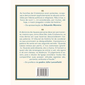 São João Crisóstomo, doutor da Igreja, defensor dos pobres e maior orador da história. Em A riqueza e a pobreza são destacados seus sermões que denuciavam os abusos cometidos por grandes líderes. Jesus fez dos empobrecidos os primeiros beneficiários do reino de Deus e, ao longo do tempo, eles vêm sendo uma preocupação constante da Igreja católica. A doutrina social do cristianismo dos primórdios se condensou em dois princípios: primeiro, o supérfluo do rico é o necessário do pobre; e o segundo, aquele que possui bens é apenas o seu administrador e não o seu dono. Por isso, entendemos por que, ao ser nomeado bispo de Constantinopla, a primeira atitude de São João Crisóstomo foi colocar todos os bens da Igreja a serviço dos mais necessitados. Esta edição de A riqueza e a pobreza , com os quatro famosos sermões sobre o pobre Lázaro e o homem rico, conta com a admirável apresentação de Eduardo Moreira, que, ao escutar seu coração e a mensagem do Evangelho, fez-se um corajoso defensor dos mais pobres e um denunciante das causas da desigualdade. Há também o prefácio de padre Júlio Lancellotti, o pastor dos desgarrados e daqueles em situação de rua. Ele comenta o destino dos lázaros modernos, conclama o amor e a solidariedade para com população marginalizada e incita ao questionamento para a construção de um mundo mais humanizado. Neste livro, Crisóstomo alicerceia-se na palavra bíblica e nos valores cristãos primordiais, transmitindo ensinamentos que extrapolam os limites da religião e da fé. Defende a existência fraterna entre todos os seres humanos, baseada no amor e na compaixão. Suas palavras são para hoje e guardam perene atualidade. Leonardo Boff, teólogo, filósofo e professor aposentado de Ética, Filosofia da Religião e Ecologia na Universidade do Estado doRio de Janeiro (UERJ) “As homilias de Crisóstomo eram potentes, corajosas e denunciavam explicitamente os abusos cometidos por líderes políticos e religiosos. Não à toa, o ‘boca de ouro’ […] é considerado, por muitos, até hoje, o maior pregador cristão da história”. – Da apresentação de Eduardo Moreira “A denúncia da riqueza perversa deve ser permanente, mesmo que, como diz São João Crisóstomo, os ricos ébrios em suas tavernas desconsiderem nossas palavras. O tribunal da história há de condenar os que promovem as desigualdades. Impressiona a palavra do santo em seu segundo sermão: ‘Quando Lázaro estava por perto, o rico costumava ignorá-lo. Quando está distante, ele o chama. O homem a quem ele não enxergava ao entrar e sair, ele agora o vê com clareza, na distância.’ O julgamento é severo, pois o doutor da Igreja considera ‘roubo não compartilhar suas posses’; atitudes egoístas são, portanto, embuste e fraude.” – Do prefácio de padre Júlio Lancellotti