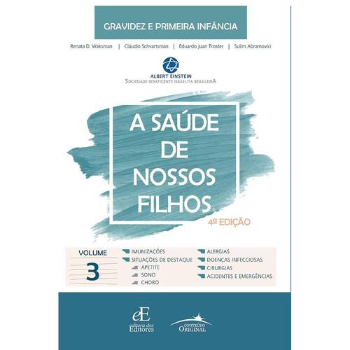 Estamos agora na quarta edição de A Saúde de Nossos Filhos, em formato de manual, dividido em quatro volumes e abordando os principais assuntos e questões que envolvem a primeira infância. O período decorrido entre a terceira e a quarta edições, de 8 anos, é longo se considerarmos a evolução da pediatria, o que nos fez apresentar esta edição revisada, atualizada, ampliada e adequada a todos os conceitos e informações atuais. Este é o terceiro volume e começa com a exposição detalhada e atual das imunizações, destacando as vacinas mais recentes, incorporadas aos calendários vigentes. A seguir, vem a seção das situações de destaque, em que ocupam lugar nos tempos atuais: meu filho tem alteração do apetite, não sai da frente das telas, não quer estudar, não obedece, é desatento, não dorme ou vive doente, entre outras. Pensando nos dias de hoje, alguns assuntos de saúde, sinais e sintomas não poderiam ser esquecidos, como as alergias, as doenças infecciosas atuais e antigas que, volta e meia, retornam, e as patologias que envolvem procedimentos cirúrgicos de abdome e genitais. Este volume chega à parte final apresentando e descrevendo as causas que mais matam nossas crianças a partir de 1 ano de vida - os acidentes, sem esquecer do mais importante na sua abordagem, que é a prevenção, além dos primeiros socorros e continua pelas principais emergências, como traumas em todos os segmentos corporais, parada respiratória e cardíaca, síncope e morte súbita, que pais e cuidadores podem, em algum momento, ter de enfrentar. Esta obra reflete o principal objetivo da série, o de que a Pediatria moderna não pode e não deve se restringir aos limites do hospital e deve trabalhar em ações de promoção da saúde e na prevenção de doenças, sempre junto da comunidade. Todo este esforço somente foi possível graças ao apoio decidido que a diretoria da Sociedade Beneficente Israelita Brasileira Hospital Albert Einstein sempre ofereceu às iniciativas do nosso Departamento Materno Infantil. Esp
