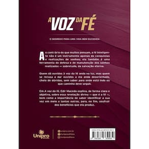 Ao contrário do que muitos pensam, a fé inteligente não é um instrumento apenas de conquistas e realizações de sonhos; ela também é uma ferramenta de defesa e de manutenção dos sonhos realizados sobretudo, da salvação eterna. Quem dá ouvidos à voz da fé anda na luz, mas quem se recusa a dar ouvidos a ela anda desorientado, cheio de dúvidas, sem saber para onde está indo ou que caminho deve seguir. Em A voz da fé, Edir Macedo explica, de forma clara e objetiva, sobre essa revelação divina que é a fé , bem como a importância de saber identificar a sua voz em meio a tantas outras, para, no fim, usufruir dos benefícios que ela produz. Ean: 9786589769989