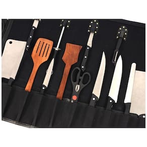 Costurado por artesãos de classe mundial, o Aaron Leather Knife Roll é feito à mão com couro de bezerro de qualidade premium. Existem 2 fivelas vintage elegantes que formam um rolo apertado, com bolsos elásticos para facas e 1 bolsa com zíper durável para manter as facas seguras enquanto você está em movimento. Pode ser como estojo de zenamento de facas zenando 10 facas de cozinha e outros acessórios. Também pode ser como suporte de utensílios. Pode conter facas de até 18 de comprimento Marca: Não Informado