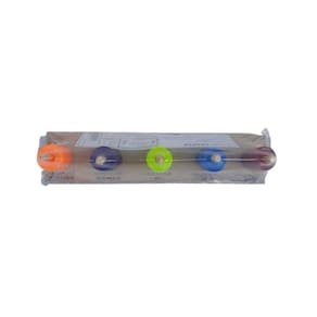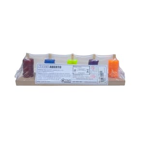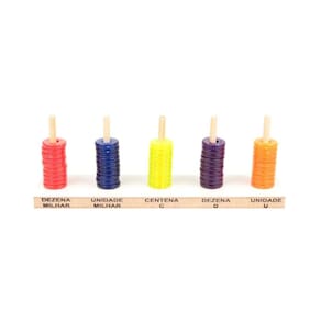 COMPOSTO POR: uma base em MDF serigrafada atóxica medindo 30 x 7 x 9 cm, 5 hastes fixas na base e 50 argolas em PVC rígido, translúcidas e coloridas.