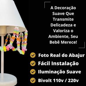 Artesanal, design moderno, ideal para decoração de quarto de crianças, bebê, ilumina muito bem e realça o ambiente. Especificações abajur: - cúpula de polipropileno plástico resistente na cor branco; - base em acrílico branco; - haste de acrílico branco; - pingentes de balinhas, pérolas, caracol, borboletas; - altura total do abajur 30 cm; - diâmetro maior da cúpula mede 17 cm; - soquete para lâmpadas modelo e-27 bivolt aceita lâmpadas 110v e 220v ; - usar lâmpada de no máximo 40w lâmpada não incluso ; - importante: imagens reais do produto, porém as cores dos pingentes e pérolas podem variar de acordo com cada produto fabricado, conforme disponibilidade Do atenção mamãe grande por tempo limitado Marca: Não Informado
