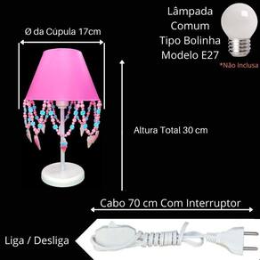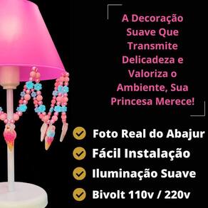 Artesanal, design moderno, ideal para decoração de quarto de crianças, bebê, ilumina muito bem e realça o ambiente. Especificações abajur: - cúpula de polipropileno plástico resistente na cor rosa pink; - base em acrílico branco; - haste de acrílico branco; - pingentes de sorvete, pérolas rosa, flor azul; - altura total do abajur 30 cm; - diâmetro maior da cúpula mede 17 cm; - soquete para lâmpadas modelo e-27 bivolt aceita lâmpadas 110v e 220v ; - usar lâmpada de no máximo 40w lâmpada não incluso ; - importante: imagens reais do produto, porém as cores dos pingentes e pérolas podem variar de acordo com cada produto fabricado, conforme disponibilidade Do atenção mamãe grande por tempo limitado Marca: Não Informado