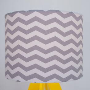 Abajur com base em madeira na cor amarela e cúpula revestida com tecido estampado chevron nas cores cinza e branco. Cúpula medindo 20 cm de diâmetro x 15 cm de altura. Dimensões do produto: Altura: 35 cm Largura: 20 cm. Bivolt. Usar lâmpadas fluorescentes ou LED. Fio branco com plug liga desliga. Fio com 1,7 metros.