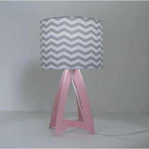Abajur com base em madeira na cor rosa e cúpula revestida com tecido estampado chevron nas cores cinza e branco. Cúpula medindo 20 cm de diâmetro x 15 cm de altura. Dimensões do produto: Altura: 35 cm Largura: 20 cm. Bivolt. Usar lâmpadas fluorescentes ou LED. Fio branco com plug liga e desliga. Fio com 1,7 metros.