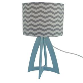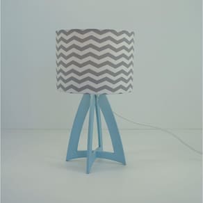 Abajur com base em madeira na cor azul bebê. Cúpula revestida com tecido Fernando Maluhy chevron. Cúpula medindo 20 cm de diâmetro x 15 cm de altura.