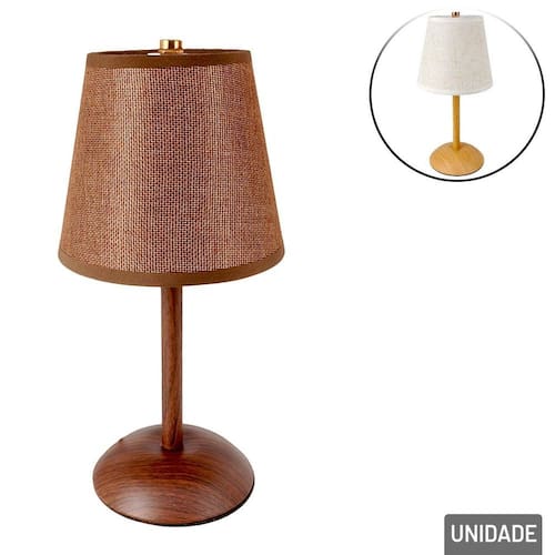 Abajur de Mesa Bivolt Cúpula Base de Metal C Transforme seus ambientes com charme e elegância usando o Abajur de Mesa. Ideal para compor espaços como quartos, salas de estar, escritórios ou hall de entrada, este abajur oferece uma iluminação acolhedora aliada a um estilo sofisticado e natural.\nA peça destaca-se pela sua base em metal resistente com acabamento que simula textura de madeira, unindo a durabilidade do metal com a beleza e o aconchego do visual madeirado. Esse acabamento proporciona um toque rústico contemporâneo, perfeito para ambientes com estilo escandinavo, industrial, moderno ou rústico-chique.\nDisponível em cores.