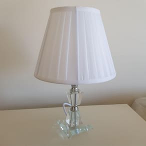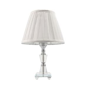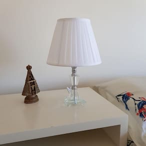 ABAJUR BIVOLT COM BASE E ESTRUTURA DE VIDRO POLIDO ESTILO CRISTAL, CÚPULA EM TECIDO BRANCO E BOTÃO LIGA /DESLIGA NO CABO.