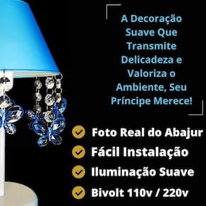 Artesanal, design moderno, ideal para decoração de quarto de crianças, bebê, ilumina muito bem e realça o ambiente. Especificações abajur: - cúpula de polipropileno plástico resistente na cor azul; - base em acrílico branco; - haste de acrílico branco; - pingentes de borboleta azul; - altura total do abajur 30 cm; - diâmetro maior da cúpula mede 17 cm; - soquete para lâmpadas modelo e-27 bivolt aceita lâmpadas 110v e 220v ; - usar lâmpada de no máximo 40w lâmpada não incluso ; - importante: imagens reais do produto, porém as cores dos pingentes e pérolas podem variar de acordo com cada produto fabricado, conforme disponibilidade Do atenção mamãe grande por tempo limitado Marca: Não Informado