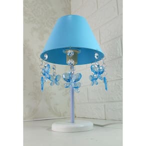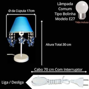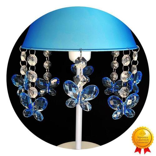 - cúpula de polipropileno plástico resistente na cor azul; - base em acrílico branco; - haste de acrílico branco; - pingentes de borboleta azul; - altura total do abajur 30 cm; - diâmetro maior da cúpula mede 17 cm; - soquete para lâmpadas modelo e-27 bivolt aceita lâmpadas 110v e 220v ; - usar lâmpada de no máximo 40w lâmpada não incluso ; - importante: imagens reais do produto, porém as cores dos pingentes e pérolas podem variar de acordo com cada produto fabricado, conforme disponibilidade Do estoque