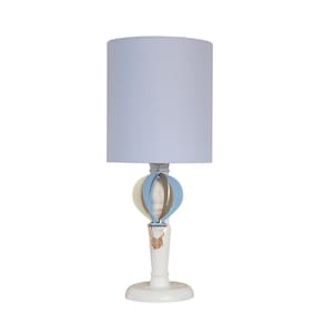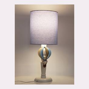 Abajur infantil balão cúpula azul base branco provençal Abajur com a base em madeira branco provençal e cúpula com acabamento em tecido.Cúpula com acabamento em tecido de algodão azulMedida do abajur- 49cm de altura já com a cúpula.Medida da cúpula - 20 cm por 23 cm altura .Fio de energia com 1,20m na tonalidade branca.Acendimento através de botão liga/desliga englobado ao fio.Pingente avião em mdf.Capacidade para 1 lâmpada- indicado led 15w não inclusa .Voltagem: bivoltSoquete: e-27 as luminárias de mesa proporcionam uma iluminação mais funcional e difusa aos ambientes e podem ser utilizadas em quartos, sala de estudos, canto de leitura, escritórios, entre outros.