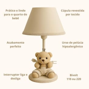 Transforme o quartinho do seu bebê em um verdadeiro reino de ternura com este lindo abajur Urso Príncipe Com um design delicado e encantador, ele combina perfeitamente com decorações nos temas Ursinho, Realeza ou Príncipe, criando um ambiente aconchegante e acolhedor. Ideal para mesas de apoio, cômodas ou criados-mudos, o abajur proporciona uma iluminação suave, perfeita para momentos de amamentação, troca de fraldas ou para deixar o bebê mais tranquilo durante a noite. Destaques do Produto: Modelo: Urso Príncipe com coroa dourada Iluminação suave, ideal para o quarto do bebê Base estável e estrutura resistente Acabamento delicado e artesanal Combina com diversos temas infantis Ótima opção de presente para chá de bebê, nascimento ou batizado Especificações Técnicas: Voltagem: 110V/220V ou bivolt Tipo de lâmpada: ex: LED ou incandescente - não inclusa Material: MDF, tecido Lindo abajur infantil em tecido com um ursinho na base para o quarto do bebê ou criança, ideal para deixar o ambiente com funcionalidade e muito mais charme e beleza. O abajur é ideal para proporcionar uma luz suave e reconfortante durante a noite, ajudando as crianças a se sentirem mais seguras e tranquilas enquanto dormem. O abajur infantil vai deixar o quarto pronto para a chegada do bebê em casa O abajur infantil e para bebês é uma ótima opção para adicionar um toque aconchegante e alegre ao quarto dos pequenos. Onde usar: Poderá ser colocado na cômoda ou mesa Contém:1 Abajur - com iluminação suave, ajuda as mamães a cuidar do bebê à noite. Composição: Abajur com cúpula de polipropileno plástico , revestido por tecido 100% algodão. Base de madeira revestida de tecido Metragem: Abajur 30cm altura Cúpula 10cm x 18cm Bivolt: 110V ou 220V Lâmpada: usar de no máximo 40W não inclusa lâmpada de bolinha Tamanho fio 90 cm com liga / desliga Conteúdo da embalagem: 1 abajur com urso na base Limpeza: Basta limpar com espanador ou pano seco.