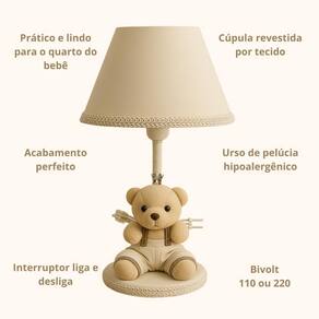 Transforme o quartinho do seu bebê em um verdadeiro reino de ternura com este lindo abajur Urso Príncipe Com um design delicado e encantador, ele combina perfeitamente com decorações nos temas Ursinho, Realeza ou Príncipe, criando um ambiente aconchegante e acolhedor. Ideal para mesas de apoio, cômodas ou criados-mudos, o abajur proporciona uma iluminação suave, perfeita para momentos de amamentação, troca de fraldas ou para deixar o bebê mais tranquilo durante a noite. Destaques do Produto: Modelo: Urso Príncipe com coroa dourada Iluminação suave, ideal para o quarto do bebê Base estável e estrutura resistente Acabamento delicado e artesanal Combina com diversos temas infantis Ótima opção de presente para chá de bebê, nascimento ou batizado Especificações Técnicas: Voltagem: 110V/220V ou bivolt Tipo de lâmpada: ex: LED ou incandescente - não inclusa Material: MDF, tecido Lindo abajur infantil em tecido com um ursinho na base para o quarto do bebê ou criança, ideal para deixar o ambiente com funcionalidade e muito mais charme e beleza. O abajur é ideal para proporcionar uma luz suave e reconfortante durante a noite, ajudando as crianças a se sentirem mais seguras e tranquilas enquanto dormem. O abajur infantil vai deixar o quarto pronto para a chegada do bebê em casa O abajur infantil e para bebês é uma ótima opção para adicionar um toque aconchegante e alegre ao quarto dos pequenos. Onde usar: Poderá ser colocado na cômoda ou mesa Contém:1 Abajur - com iluminação suave, ajuda as mamães a cuidar do bebê à noite. Composição: Abajur com cúpula de polipropileno plástico , revestido por tecido 100% algodão. Base de madeira revestida de tecido Metragem: Abajur 30cm altura Cúpula 10cm x 18cm Bivolt: 110V ou 220V Lâmpada: usar de no máximo 40W não inclusa lâmpada de bolinha Tamanho fio 90 cm com liga / desliga Conteúdo da embalagem: 1 abajur com urso na base Limpeza: Basta limpar com espanador ou pano seco. Marca: Não Informado
