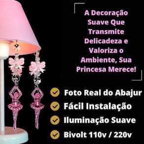 Abajur infantil lacinhos decoração quartinho de bebê simples Artesanal, design moderno, ideal para decoração de quarto de crianças, bebê, ilumina muito bem e realça o ambiente. Especificações abajur: - cúpula de polipropileno plástico resistente na cor rosa bebê;- base em acrílico branco- haste de acrílico branco- pingentes bailarinas na cor rosa pink;- lacinhos com pérolas;- argolas de inox, castanhas de acrílico transparente importado de alto brilho;- altura total do abajur 30 cm- diâmetro maior da cúpula mede 17 cm- soquete para lâmpadas modelo e-27 bivolt aceita lâmpadas 110v e 220v Usar lâmpada de no máximo 40w lâmpada não incluso atenção mamãe grande oferta por tempo limitado Marca: Lustres Sh Design