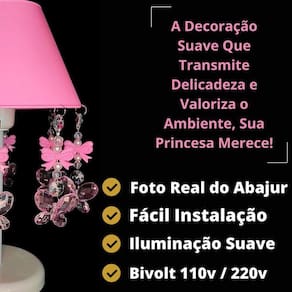 - cúpula de polipropileno plástico resistente na cor rosa bebê; - base em acrílico branco; - haste de acrílico branco; - pingentes de laços e borboletas rosa; - altura total do abajur 30 cm; - diâmetro maior da cúpula mede 17 cm; - soquete para lâmpadas modelo e-27 bivolt aceita lâmpadas 110v e 220v ; - usar lâmpada de no máximo 40w lâmpada não incluso ; - importante: imagens reais do produto, porém as cores dos pingentes e pérolas podem variar de acordo com cada produto fabricado, conforme disponibilidade Do estoque