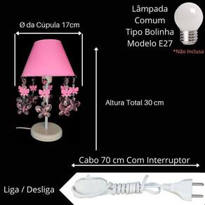 - cúpula de polipropileno plástico resistente na cor rosa bebê; - base em acrílico branco; - haste de acrílico branco; - pingentes de laços e borboletas rosa; - altura total do abajur 30 cm; - diâmetro maior da cúpula mede 17 cm; - soquete para lâmpadas modelo e-27 bivolt aceita lâmpadas 110v e 220v ; - usar lâmpada de no máximo 40w lâmpada não incluso ; - importante: imagens reais do produto, porém as cores dos pingentes e pérolas podem variar de acordo com cada produto fabricado, conforme disponibilidade Do estoque