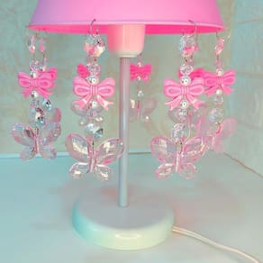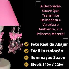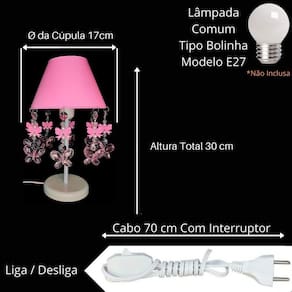 - cúpula de polipropileno plástico resistente na cor rosa bebê; - base em acrílico branco; - haste de acrílico branco; - pingentes de laços e borboletas rosa; - altura total do abajur 30 cm; - diâmetro maior da cúpula mede 17 cm; - soquete para lâmpadas modelo e-27 bivolt aceita lâmpadas 110v e 220v ; - usar lâmpada de no máximo 40w lâmpada não incluso ; - importante: imagens reais do produto, porém as cores dos pingentes e pérolas podem variar de acordo com cada produto fabricado, conforme disponibilidade Do estoque
