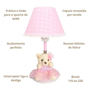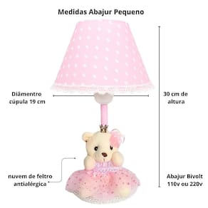 Transforme o quartinho do seu bebê em um verdadeiro reino de ternura com este lindo abajur Ursa Princesa Com um design delicado e encantador, ele combina perfeitamente com decorações nos temas Ursinha, Realeza ou Princesa, criando um ambiente aconchegante e acolhedor. Ideal para mesas de apoio, cômodas dentre outros, o abajur proporciona uma iluminação suave, perfeita para momentos de amamentação, troca de fraldas ou para deixar o bebê mais tranquilo durante a noite. Destaques do Produto: Modelo: Ursa Princesa com coroa dourada Iluminação suave, ideal para o quarto do bebê Base estável e estrutura resistente Acabamento delicado e artesanal Combina com diversos temas infantis Ótima opção de presente para chá de bebê, nascimento ou batizado Especificações Técnicas: Voltagem: 110V/220V ou bivolt Tipo de lâmpada: ex: LED ou incandescente - não inclusa Material: MDF, tecido Lindo abajur infantil em tecido com um ursinha na base para o quarto do bebê ou criança, ideal para deixar o ambiente com funcionalidade e muito mais charme e beleza. O abajur é ideal para proporcionar uma luz suave e reconfortante durante a noite, ajudando as crianças a se sentirem mais seguras e tranquilas enquanto dormem. O abajur infantil vai deixar o quarto pronto para a chegada do bebê em casa O abajur infantil e para bebês é uma ótima opção para adicionar um toque aconchegante e alegre ao quarto dos pequenos. Onde usar: Poderá ser colocado na cômoda ou mesa Contém:1 Abajur - com iluminação suave, ajuda as mamães a cuidar do bebê à noite. Composição: Abajur com cúpula de polipropileno plástico , revestido por tecido 100% algodão. Base de madeira revestida de tecido Metragem: Abajur 30cm altura Cúpula 10cm x 18cm Bivolt: 110V ou 220V Lâmpada: usar de no máximo 40W não inclusa lâmpada de bolinha Tamanho fio 90 cm com liga / desliga Conteúdo da embalagem: 1 abajur com urso na base Limpeza: Basta limpar com espanador ou pano seco. Marca: Não Informado Ean: 7898704681730