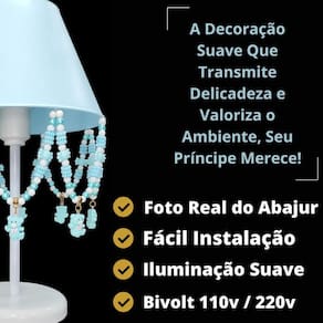 Artesanal, design moderno, ideal para decoração de quarto de crianças, bebê, ilumina muito bem e realça o ambiente. Especificações abajur: - cúpula de polipropileno plástico resistente na cor azul; - base em acrílico branco; - haste de acrílico branco; - pingentes de urso, balinha azul, pérolas, caracol; - altura total do abajur 30 cm; - diâmetro maior da cúpula mede 17 cm; - soquete para lâmpadas modelo e-27 bivolt aceita lâmpadas 110v e 220v ; - usar lâmpada de no máximo 40w lâmpada não incluso ; - importante: imagens reais do produto, porém as cores dos pingentes e pérolas podem variar de acordo com cada produto fabricado, conforme disponibilidade Do atenção mamãe grande por tempo limitado Marca: Não Informado
