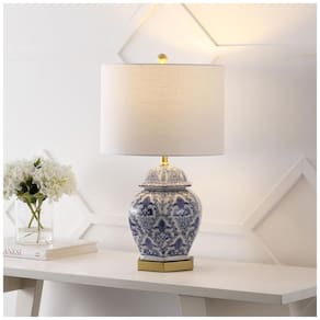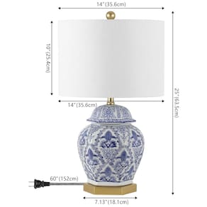 Base da lâmpada: E26 Dimensões do produto: 35,56 cm x 35,56 cm x 63,50 cm Peso do item: 3,58 quilos Estilo: Clássico, Tradicional Cor: Azul Branco Potência: 100 watts Brilho: 800 Lúmens Código UPC: 819727026732 Número do modelo: JYL3051A Marca: Não Informado