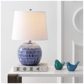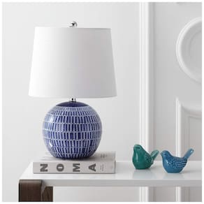 Esta luminária de mesa JONATHAN Y combina um design clássico com um toque moderno. Seu corpo esférico em cerâmica é pintado à mão com um elegante padrão de vieira em índigo, oferecendo um estilo sofisticado e atemporal. A cúpula de tambor ligeiramente cônica complementa a base e é ideal para ser usada em pares, como lâmpadas de destaque em cada lado da cama.