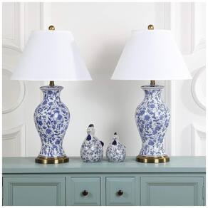 Esta luminária com design de urna floral de Pequim traz o charme clássico da Chinoiserie em azul e branco, adornada com flores e trepadeiras elegantes. Feita de cerâmica esmaltada, a peça é destacada por uma base e pescoço em ouro antigo, oferecendo um brilho quente e atraente que complementa perfeitamente salas tradicionais.