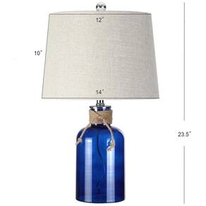 Esta luminária de mesa combina elegância e inspiração costeira com sua base de garrafa de vidro em um tom azul, que remete ao vidro marinho. Detalhada com um toque de corda náutica e acabamento cromado, a base de vidro refrata a luz, criando um brilho quente e acolhedor no ambiente. O abajur, feito de 100% algodão na cor cinza natural, complementa perfeitamente o design, adicionando um toque sutil de inspiração oceânica ao seu espaço.