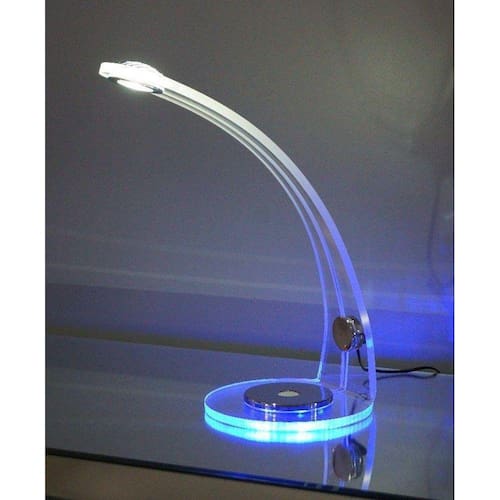 Abajur luminária de mesa eros de led touch em acrilico 2w Luminária de leitura e abajur com design moderno e arrojado, fabricado em metal cromado com a base em acrílico com iluminação em led azul de 6 pontos de 0,1w na base criando um efeito aconchegante, com a iluminação em led branca de 2w, o acendimento se faz por toque na base em que se escolhe por estágios acender somente a base azul ou acender somente a luz branca ou acender as duas luzes juntas. É indicado para quartos, salas, escritórios, home office. Abajur de led 2w + 1w cromado com acrílico transparente, acendimento por toque em 4 fases. Módulo de led já acompanha a peça. Produto montado. Medidas: h 33 cm - l 16 cm - p 26 cm. Bivolt.