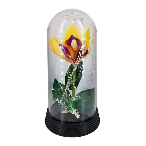 Com 10 cm de diâmetro por 19 cm de altura, a luminária possui uma base de plástico na cor ouro velho, que confere um toque de elegância ao ambiente. A cúpula é feita de acrílico, proporcionando um efeito luminoso suave e agradável. A flor de lírio, feita de material artificial, adiciona um charme especial à luminária.