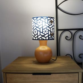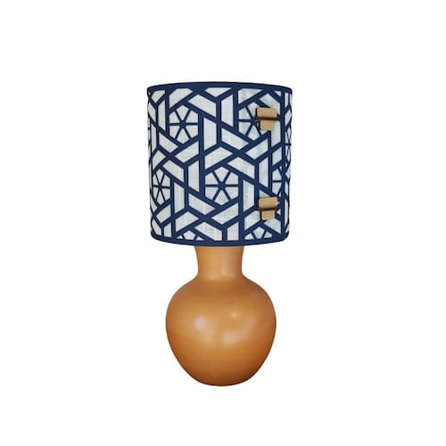 Abajur de mesa com base em cerâmica rústica. Base envernizada. Cúpula revestida com tecido arabesco azul escuro. Cúpula medindo 15 cm de diâmetro e 15 cm de altura. Cúpulas co detalhes para fechamento em madeira.Dimensões totais do produto: Altura: 31 cm Largura: 15 cmBivolt. Usar lâmpadas fluorescentes ou LED. Fio preto com plug liga e desliga. Soquete E-27Ficha técnica- Cores: Cerâmica e azul escuro- Largura total: 15 cm- Cor do abajur: Azul escuro- Altura total: 31 cm- Cor da base: Terracota- Diâmetro total: 15 cm