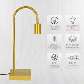 Abajur Sala Luminária De Mesa Com Moderno Dourado Transforme seu ambiente com o abajur um modelo sofisticado que combina design moderno e iluminação eficiente. Seu acabamento em alumínio dourado proporciona um toque elegante e contemporâneo para qualquer espaço. Destaques do produto com um design moderno e sofisticado - combinando com qualquer decoração e ambiente. modelo : abajur cor es : dourado pintura pó . material de alta qualidade : feita com um alumínio resistente para maior durabilidade. compatível com lâmpadas e27. ideal para diferentes ambientes - perfeita para quartos, salas, escritórios e áreas gourmet. peça com acionamento em instalado no ambiente. modelo não recarregável. de 3 meses. Especificações técnicas Ab 6086 base madeira 200x130x430mm e27 drp Material : alumínio e madeira Cor : dourado Cabo de iluminação : 2 mts regulável Base madeira : 120 mm x 15mm Soquete da luminária : e27 Cabo : 110mm Número de lâmpadas : 1 lâmpada Voltagem : 127v - 220v Medida : 430mm x 200mm x 130mm Peso : 768gr Quantidade : 1 produtos. Observação : a lâmpada não acompanha o produto. O produto necessita estar ligada na rede elétrica para o funcionamento adequado. Conteúdo da embalagem : 1 abajur. Marca: Não Informado Ean: 7893313586889