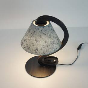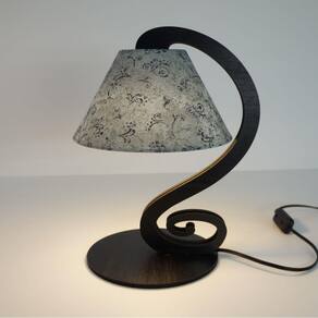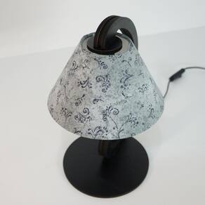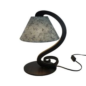 Abajur com base em MDF na cor preta recortado a laser, cúpula revestida em tecido estampado nas cores preto e branco.