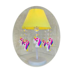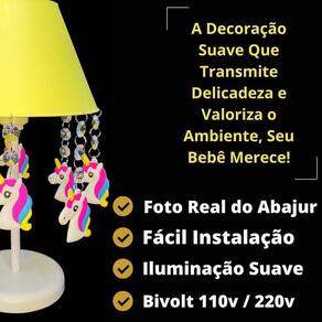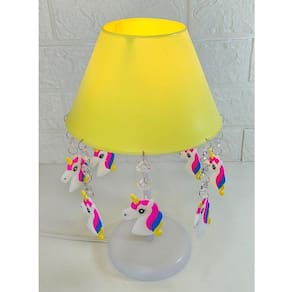 Especificações do Abajur de Unicórnio: - Cúpula de Polipropileno Plástico Resistente na Cor Amarelo; - Base em Acrílico Branco; - Haste de acrílico branco; - Pingentes de Unicórnio Aplique Emborrachado ; - Argolas de Inox, Castanhas de Acrílico Transparente; - Altura Total do Abajur 30 cm; - Diâmetro Maior da Cúpula mede 17 cm; - Soquete para Lâmpadas Modelo E-27 bivolt aceita lâmpadas 110v e 220v ; - Usar Lâmpada de no Máximo 10W Lâmpada Não Inclusa .