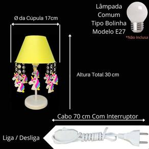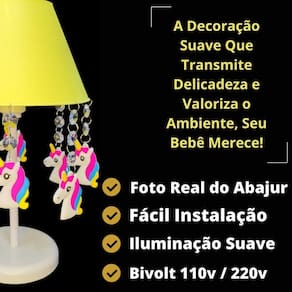 - O abajur vem com os pingentes de unicórnio? Sim, o abajur possui pingentes de unicórnio feitos de aplique emborrachado, que adicionam um charme especial à peça.