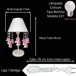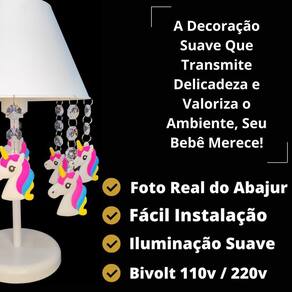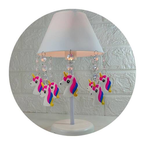 Esta luminária possui uma cúpula de polipropileno resistente na cor branca, que proporciona uma luz suave e aconchegante. Sua base e haste são feitas de acrílico branco, garantindo a estabilidade e durabilidade do abajur. Os pingentes de unicórnio, feitos de aplique emborrachado, adicionam um charme especial ao produto.