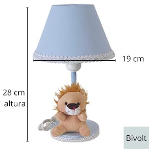 O Abajur Infantil Bebê Quarto Criança Azul Safari é composto por uma cúpula de polipropileno revestida por tecido 100% algodão e uma base de madeira revestida de tecido. Sua altura é de 28cm, enquanto a cúpula possui 8cm de altura e 19cm de diâmetro.