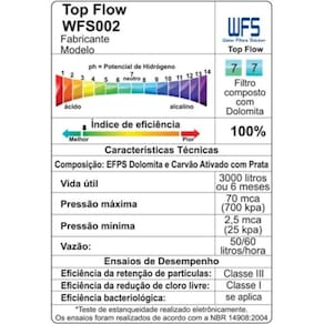 Vida útil: 3000 litros ou 6 meses Pressão de Operação: 25 a 700 kPa Vazão: 50/60 litros/hora Retenção de Partículas: Classe III Retenção da Redução de Cloro Livre: Classe I Eficiência bacteriológica: Se aplica
